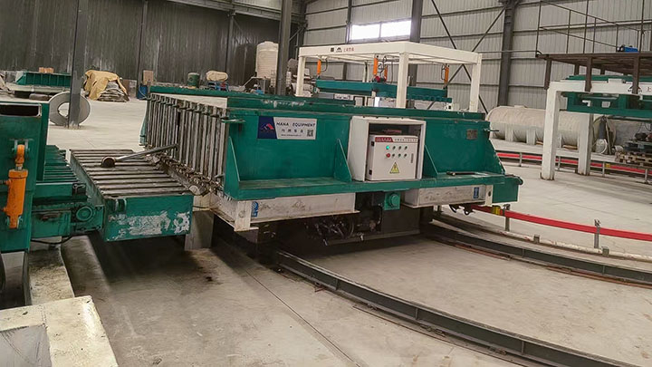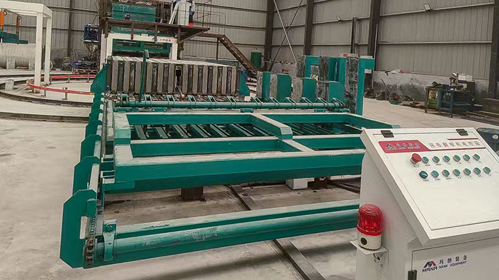 出板系統(tǒng)由出板機(jī)與翻板機(jī)組成。出板機(jī)采用一次拖板設(shè)計(jì),配備變頻驅(qū)動裝置,具有拉力大、運(yùn)行平穩(wěn)、效率高等優(yōu)點(diǎn)。取出的板材可通過液壓系統(tǒng)實(shí)現(xiàn)自動合攏。翻板機(jī)通過液壓驅(qū)動,將墻板旋轉(zhuǎn)90度,并自動將板材與鋁合金底模分離,隨后再進(jìn)行第二次90度翻轉(zhuǎn),完成出板全過程。