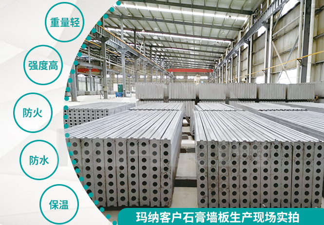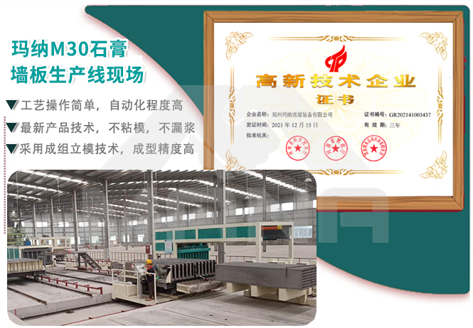 瑪納公司M30石膏墻板生產線是在瑪納研制機動成組立模墻板成型工藝的基礎上,結合國外石膏墻板生產工藝,經過技術創新,推出的新型石膏墻板生產線,生產的石膏墻板具有“成型精度高、輕質高強、耐水、防火”等特性。同時瑪納M30石膏墻板生產線具備結構合理、操作簡單、便于移動、石膏墻板長度可調、勞動強度低、能耗低等優點,解決了現有技術中的問題。