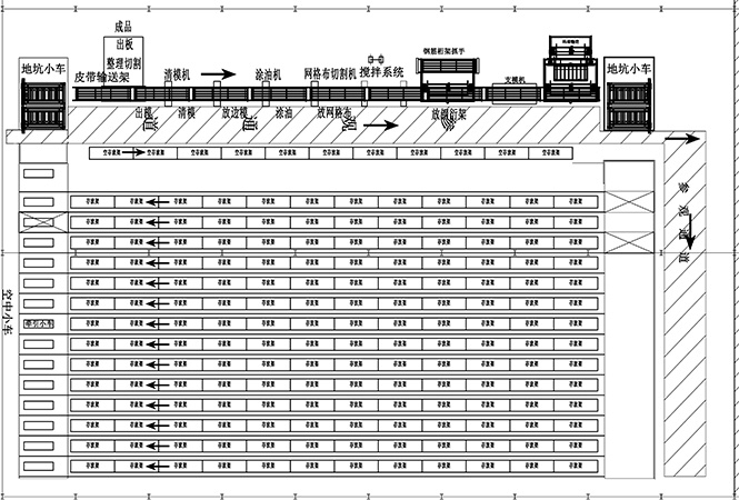 1. 功能主機(jī)模塊包括:出板系統(tǒng)、清理系統(tǒng)、自動(dòng)端模系統(tǒng)、涂油系統(tǒng)、網(wǎng)片布網(wǎng)切割系統(tǒng)、精準(zhǔn)布料系統(tǒng)、整平系統(tǒng)(含毛面處理)和桁架定位入系統(tǒng)。