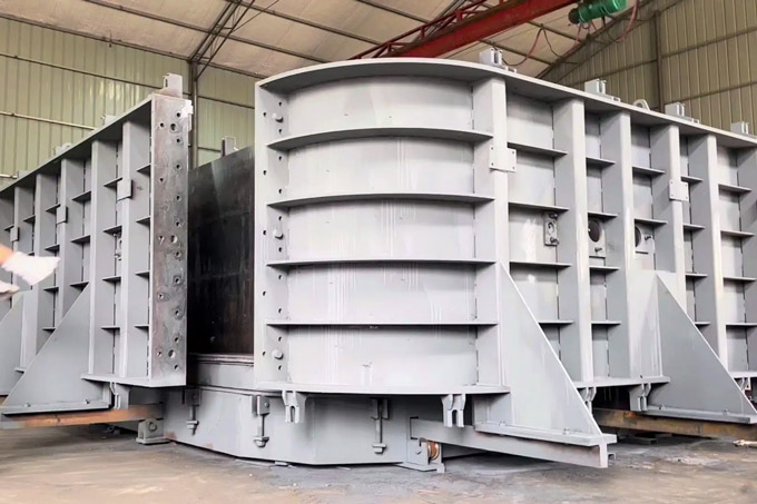 在矩形隧道管節生產時,通常是先將矩形管節模板拆分開,然后將捆扎好的鋼筋結構放在兩豎直固定的固定板之間,再將兩拆分后的側固定板與兩豎直固定板合攏,并向合攏后的管節模板中澆筑混凝土,待混凝土凝固后將管節模板拆分,將凝固后的隧道管節從模板中吊出,從而完成矩形隧道管節的生產。